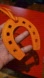 Bright orange horseshoe-shaped bag charm. Perfect accessory for adding a pop of color.