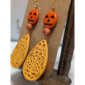 Orange Jack-O'-Lantern and Yellow Wood Filigree Earrings
