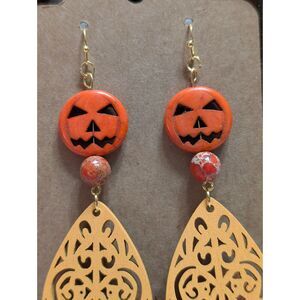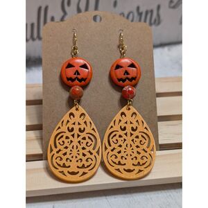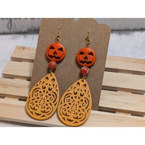 A sophisticated touch of Halloween fun to your look! These eye-catching drop earrings feature a carved orange Jack-O'-Lantern bead with a slightly wicked grin. Below the pumpkin, an orange and cream marbled accent bead adds texture before connecting to a long, teardrop wooden charm. The wooden charm is a beautiful ochre yellow/orange and is intricately cut with an ornamental pattern, giving these a unique, elevated boho-chic feel.