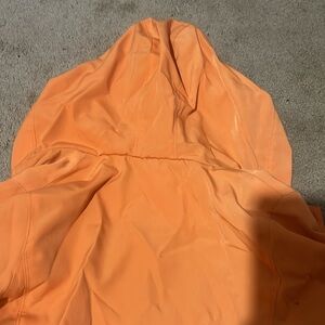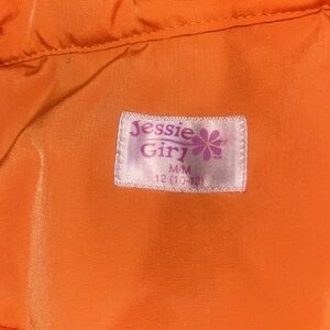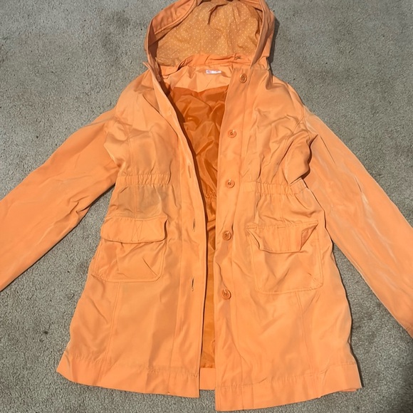 Jessie Girl Orange Jacket, Rain jacket, reflective bright orange. With Hood, tiny hold on back shoulder, nice quality jacket size medium 10-12