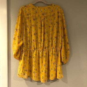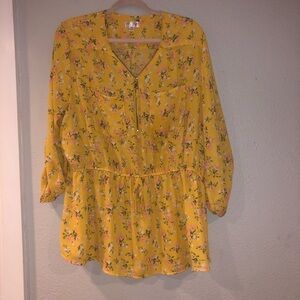 Gorgeous marigold yellow with a sweet flora pattern. Gold details and zipper is functional! Popover style blouse with elastic and tie waist creating a flattering peplum hem.