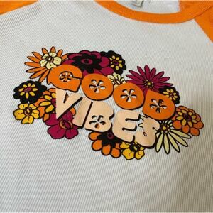 Orange Kiss brand orange & white ribbed 70's style cropped "good vibes" SZ SM