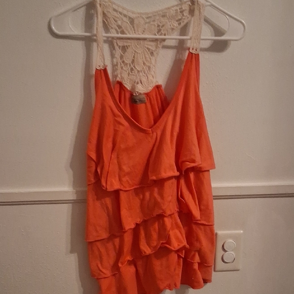 This stylish orange top features a beautiful lace back and playful ruffles. Perfect for a casual day out or a night on the town.