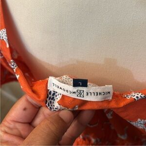 Stylish orange top featuring a bold leopard print by MICHELLE MCDOWELL…Perfect for adding a pop of color to your wardrobe. Size large in excellent condition.. armpit to armpit 18”…shoulder to waist 25”