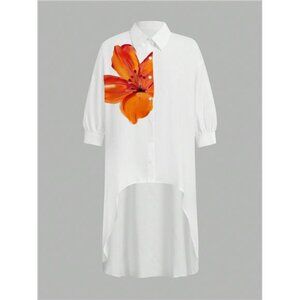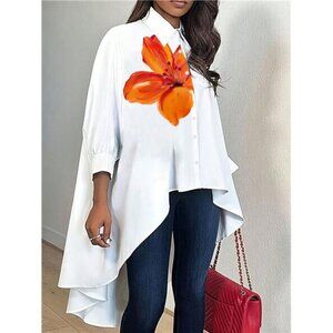 Orange Lily Flower Printed Asymmetrical Hem Long Sleeve Shirt For Women