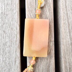 Carefully selected natural gemstone connected with exquisite braided craft, creates this delicate braided hanging accessory. The featured pendant shows a Chinese popular decorations: lotus and fish.