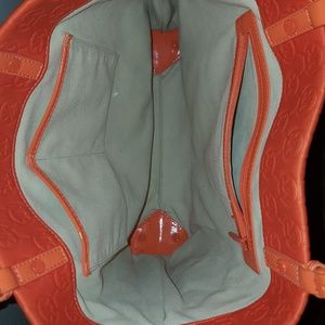 Orange Michael Kors purse. Used a few times. In good condition. No wear and tear on the straps. Only flaw is the stain in the bottom right hand corner, which I have NOT tried to clean off. Retail price is $110 and I'm just trying to get rid of things before my daughter comes!