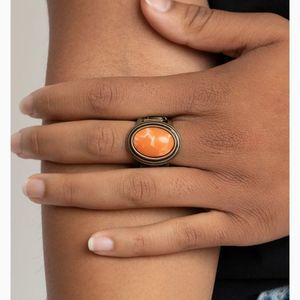 An oval orange stone is pressed into the center of a stacked brass frame, creating an earthy centerpiece atop the finger. Features a stretchy band for a flexible fit.