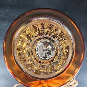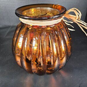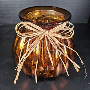 An orange mercury glass pumpkin shaped votive or candle holder with a raffia bow tie. This pretty ribbed glass bowl has an age mercury glass interior that gives the orange glass bowl a really pretty aged appearance. There are lots of light and dark orange patches that give the glass a special detail. The glass bowl measures 7 inches tall, top of jar is 4 1/8 inch in diameter and base is 6 inches. This glass bowl is in great pre owned condition. It also makes a great vase for fresh or faux flowers. Non-smoking pet free home. @ ER HW Box #3