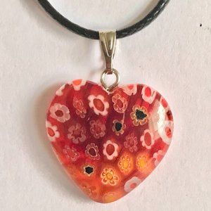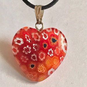 Orange Murano Glass Heart Necklace Millefiori Flowers Vintage Black Cord 18"
