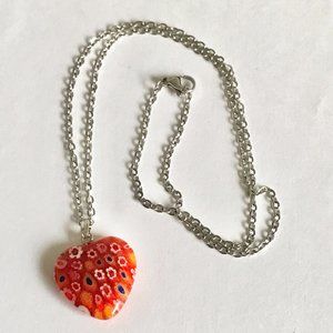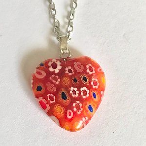 Orange Murano Glass Heart Necklace Millefiori Flowers Vintage Stainless Steel 18