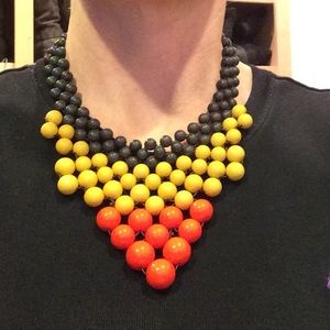 Fun, v-shaped statement piece with orange, mustard yellow, and dark grey beads.