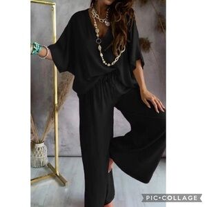 Fabulous! Two piece orange pants & top. Pants have flair legs & elastic drawstring waist. Top has V neckline & short wide sleeves. 95% Poly 5% Spandex. See last pic for sizes