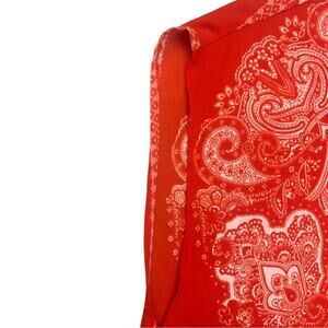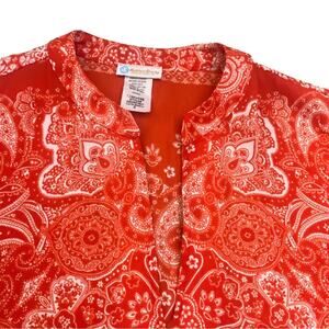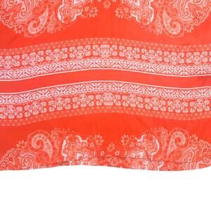 Paisley print kaftan dress by Rubber Ducky Productions. Short dress. Vibrant orange and white print. Size small. Relaxed fit. V-neckline. Pull on style. It has side pockets. Almost no sleeves. 100% polyester. Casual. Comfortable. Chic. Boho look. Dress it up or down. Can also be used as a swim coverup. Spring. Summer. Like new.