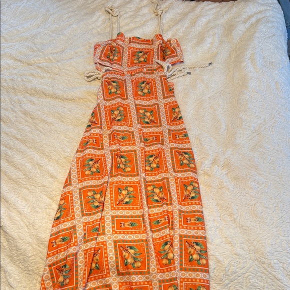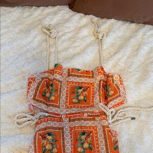 Vibrant orange sundress with a unique pattern. Features adjustable straps for a perfect fit.