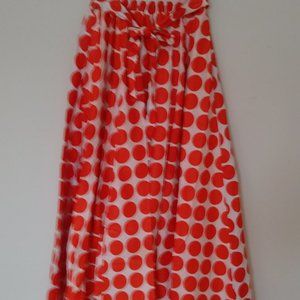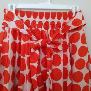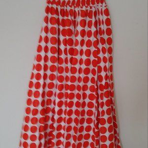 This showstopping orange and white maxi skirt is made of 100% cotton, with an elastic waist, a slit pocket on each side, and a built-in wrap for a bow. Perfect for any spring or summer occasion. One Size Fits Most.