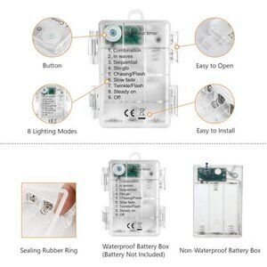 8 Light Modes and Waterproof: Choose from 8 modes including waves, combination, sequential, slo-glo, chasing/flash, slow fade, twinkle/flash, and steady on. The IP44 waterproof battery case withstands light rain and snow, suitable for indoor and outdoor use
