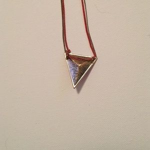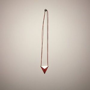 Pendant is shaped like an upside down triangle with three sides; two are orange with one gold side. One orange and one gold chain are combined with a clasp. 18" long. Not real gold. Handmade in Portland.