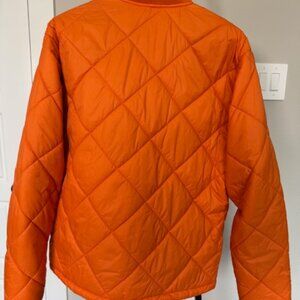 Make a bold statement with this vibrant orange quilted bomber jacket, perfect for transitional weather and layering. Designed with a diamond quilted pattern for warmth and texture, it features a snap-button front closure, ribbed cuffs, and a clean, collarless neckline. Its utilitarian vibe is matched by practical side pockets and a lightweight yet insulated feel—ideal for casual, everyday wear with a pop of color.
