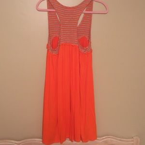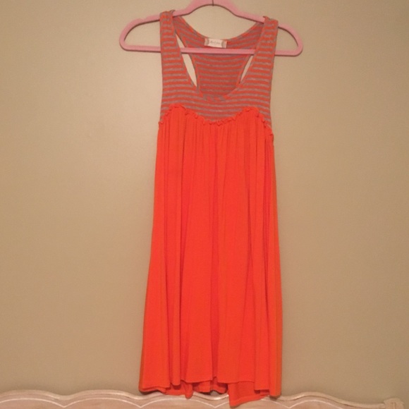 Super cute summer dress! Orange with gray stripes at the top. Very lightweight and flowy. Cool and comfortable for summer. Excellent gently used condition. Worn once, maybe twice and now it doesn’t fit anymore. Smoke free home