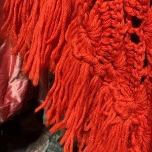 Red orange crochet knit w fringe shawl , cape , sweater , poncho