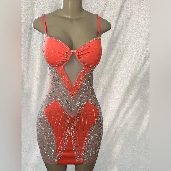 Stunning sheer mesh mini dress with rhinestone details, built-in bra cups & a body-snatching fit. Super sparkly, bold & perfect for night-out looks ✨