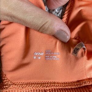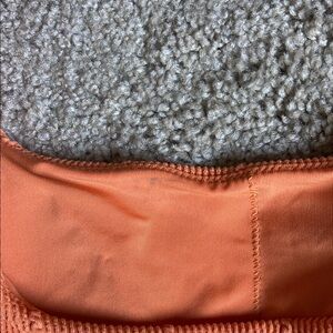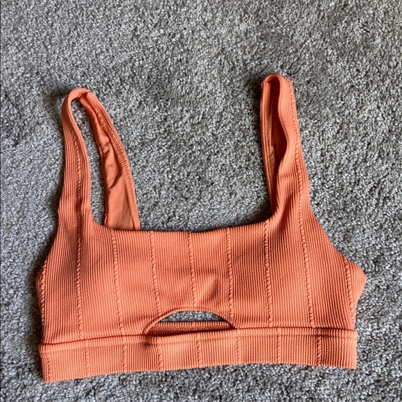 Stylish orange ribbed bathing suit with a unique cutout design. Perfect for the summer! Small stain on inside of bathing suit, see last photo for reference!