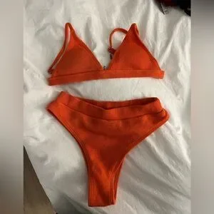 Vibrant orange ribbed bikini set perfect for a stylish beach day. Comfortable and chic design for a flattering fit.