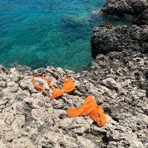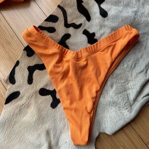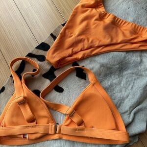 Bright orange ribbed bikini set without tags. No size tags, so I don’t actually know the size, brand, or material, so I’ve priced it low :)