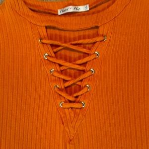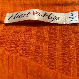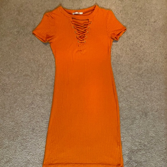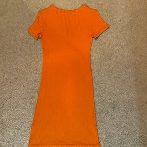 Orange ribbed summer dress. Very lightly worn. Criss cross front design. Silver detailing on brim. Short sleeved. Stretchy and fitted. Very comfortable and breathable material. Perfect for just throwing on for the summer while still being cute and making a staple with the bright color. On 5’5 the length is right above the knee. Such a cute summer dress!