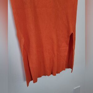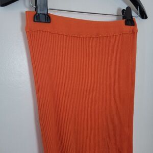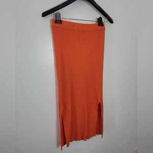 Super cute and sexy midi skirt in a thick ribbed material and bold orange color. Side slits on both sides and elastic waistband. Good condition. Size XL measures approximately 32 inches long 27 inch waist unstretched (it's very stretchy)