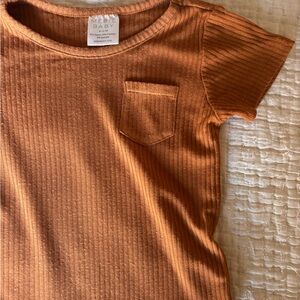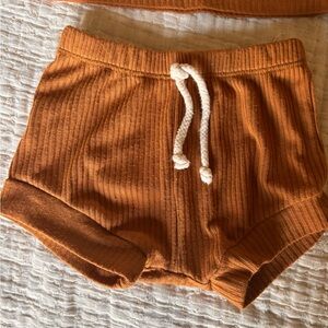 Adorable orange ribbed toddler outfit with a pocket tee and drawstring shorts from Mebie Baby. Perfect for casual wear. Size 6-12 months. Wash wear shown in photos