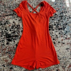 Experience ultimate comfort in this orange romper, featuring a flattering neckline and cap sleeves. The stretchy knit material offers a snug fit. Ties in the back. Super cute!!