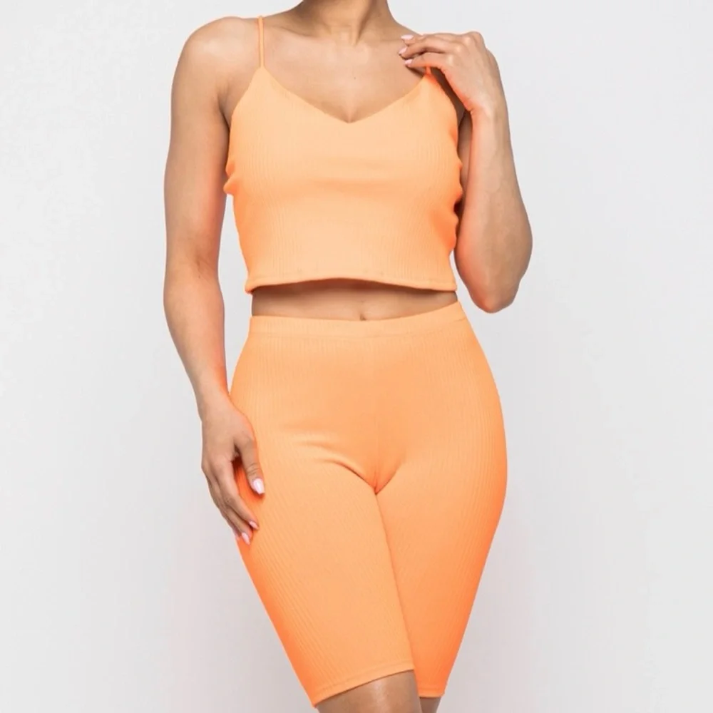Stylish ribbed two-piece set. Includes a crop top and high-waisted shorts. Perfect for casual outings.