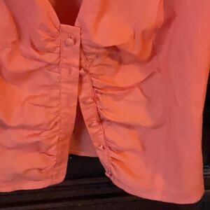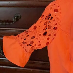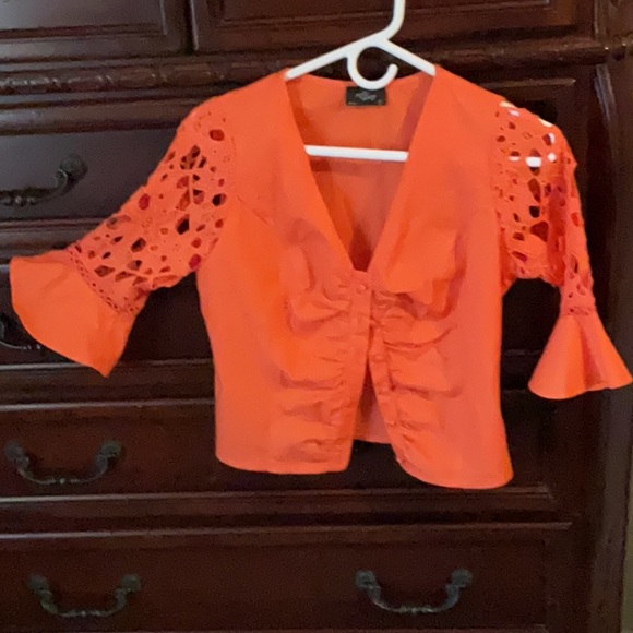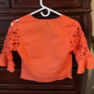 This vibrant orange blouse features a stylish ruched front and elegant ruffled sleeves with delicate cutout details. The lightweight fabric and modern cropped silhouette make it perfect for warm weather wear. Never worn, like new
