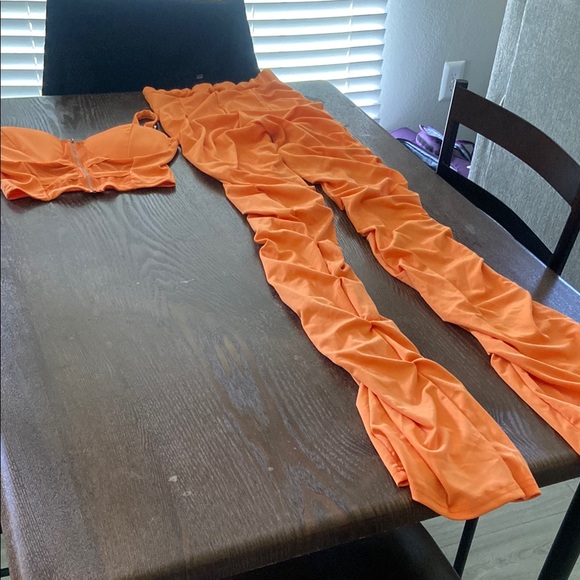 Vibrant orange two-piece set with ruched details. Includes a crop top and matching pants.