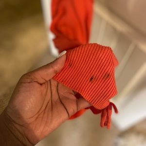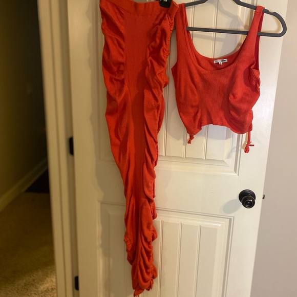 Orange Ruched set from Fashion Nova. Super stretchy and long. (Good condition however the 1X I wore it, my heel put a hole in the very bottom of the shirt)- unnoticeable when wearing.