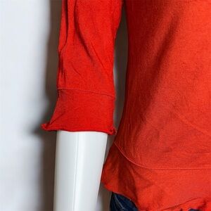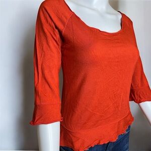 Elevate your style with this elegant orange blouse. Featuring charming ruffle details, it's perfect for any occasion. I can’t remember the name of the brand. If anyone recognizes the label and knows the brand, please let me know. If memory serves, it came from Anthropologie.