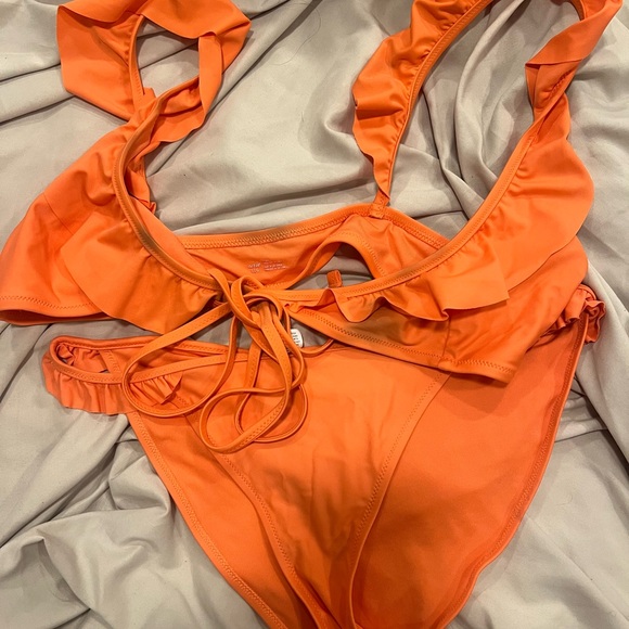 Stylish orange bikini set with ruffled details. Perfect for a beach day. Top is lrg bottoms med
