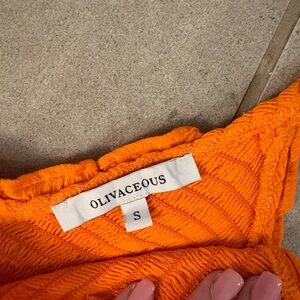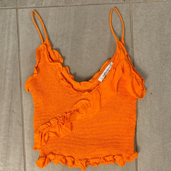 This vibrant orange camisole from Olivaceous features a playful ruffled trim and a flattering ruched neckline. The sleeveless, cropped design is perfect for a casual summer look, offering a comfortable and stylish fit.