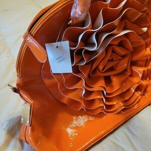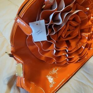 Brighten your style with this vibrant orange handbag. 2 pockets one with zipper and compartment for cell phone Featuring a unique ruffled design, it's perfect for adding a pop of color to any outfit.