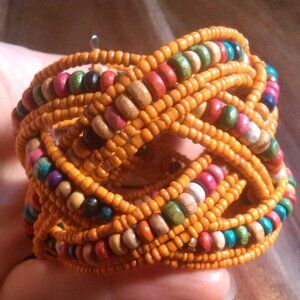 Orange Seed Bead and Multi-Color Bead Twisted Weave Cuff Bracelet