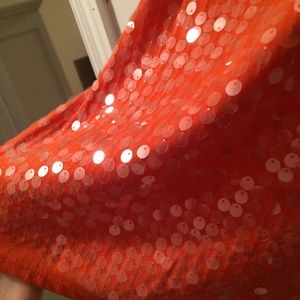 This orange tanktop is adorable. With clear sequins it is not too flashy but sure to catch the eye. Looks cute on and can go with a cardigan over or by itself😊😍 not to mention it is in great condition, worn only a couple times