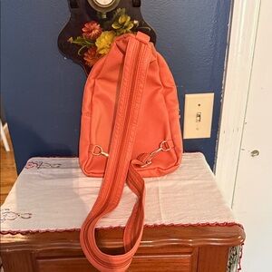 Stylish orange sling bag perfect for everyday use. Features a sleek design with multiple compartments for easy organization. Can also be worn as a backpack.