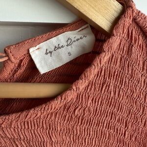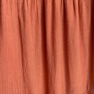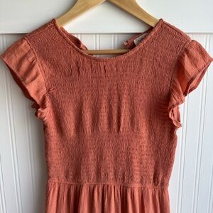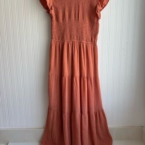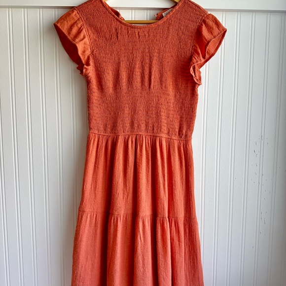 Sweet “dusty” orange dress with ruffled sleeves. Perfect for any occasion. Lightweight material, tiered skirt, and stretchy, smocked bodice. Good used condition, some signs of wear. No rips or stains. Lines to the knee.