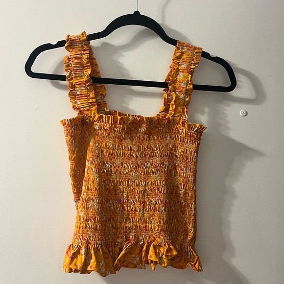 Charming floral tank with smocked design. Features ruffle straps and hem. Ideal for warm days.