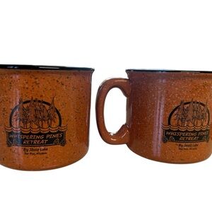 Enjoy your favorite beverages with this set of orange speckled mugs. Perfect for adding a pop of color to your dining experience. Whispering Pines Retreat cups. Heavy and thick perfect for any cabin. Set of 3.