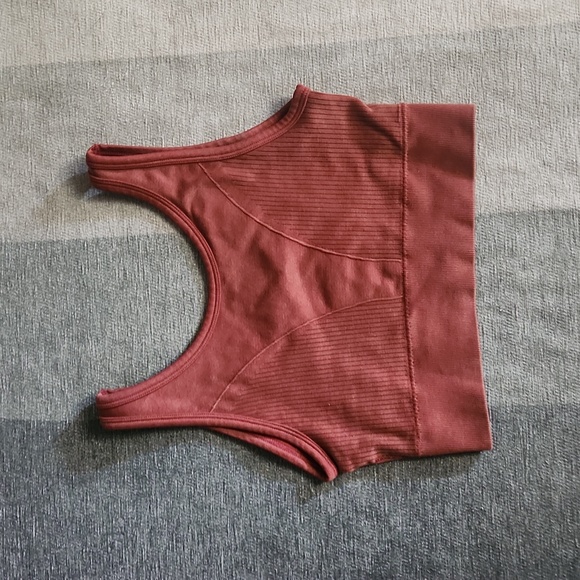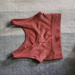 Burnt orange sports bra. The label is faded, but it was bought at tj maxx a few years ago. Size medium, but fits better on a smaller chest.