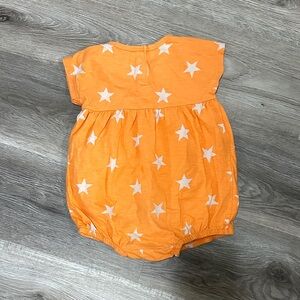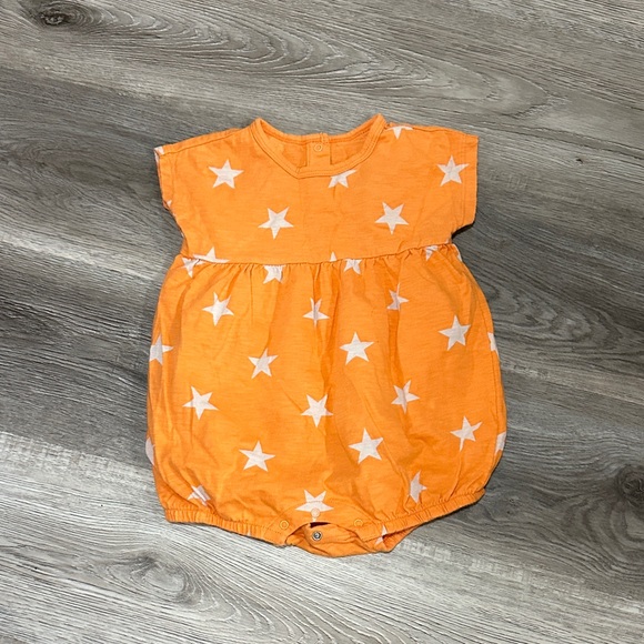Adorable orange baby romper with white star pattern. Perfect for a playful look.