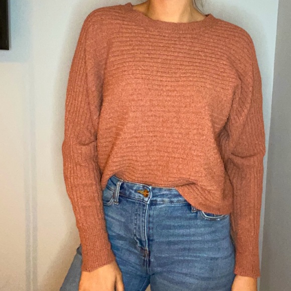 Orange sweater with horizontal strips. Love the sweater but orange does not look good with my skin tone.
